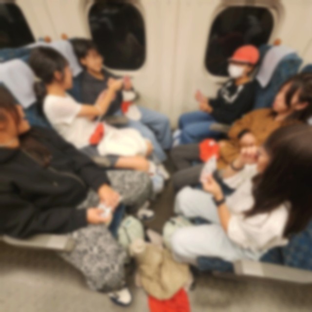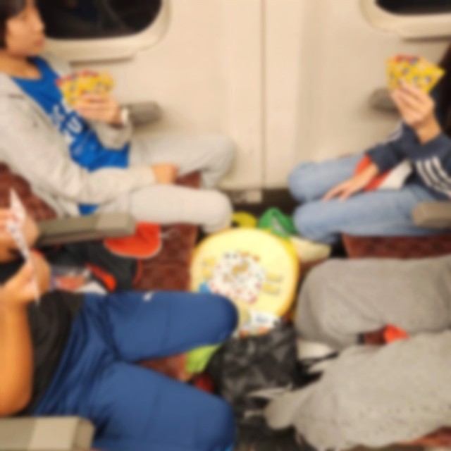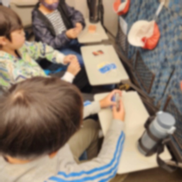 新幹線の中の様子です。トランプや、ウノ。各々自由な時間を過ごしています。