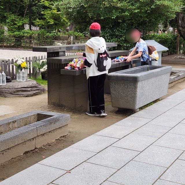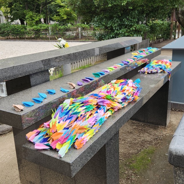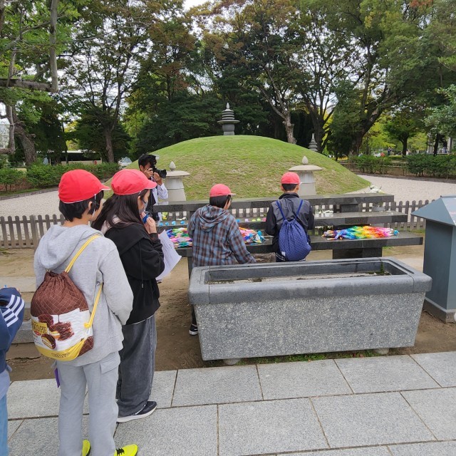 千羽鶴を供養塔にお供えしました。その後、一人一人が折った鶴も願いを込めてお供えしました。