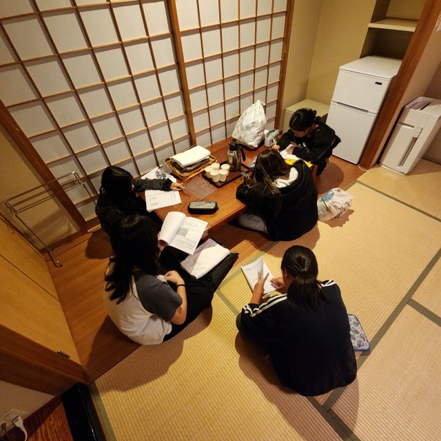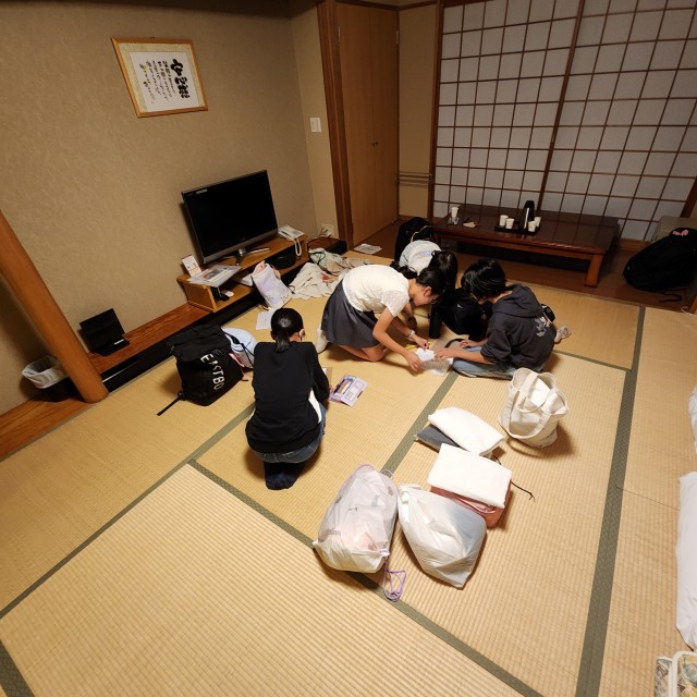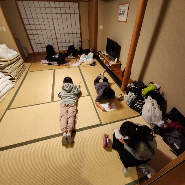 部屋に荷物を入れました。女子は 部屋で振り返りをかいてます