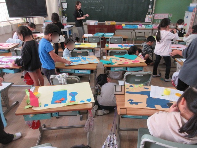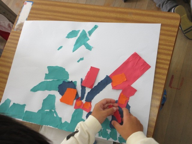 図工「やぶいたかたちからうまれたよ」のタイトル通り、色画用紙をやぶき、その紙をうまく並べて
