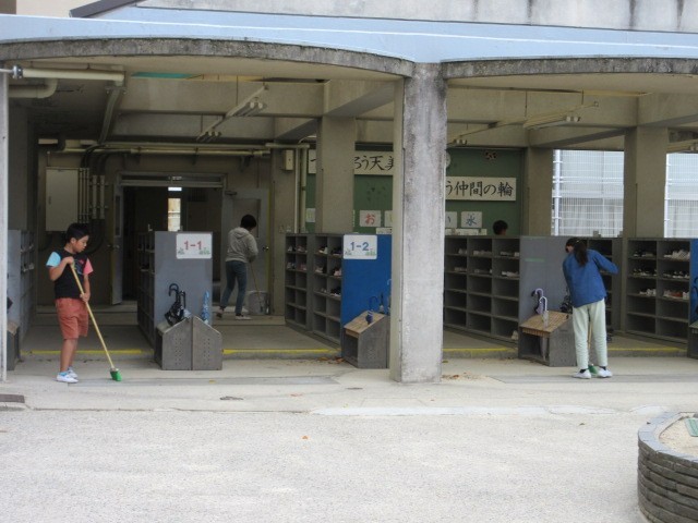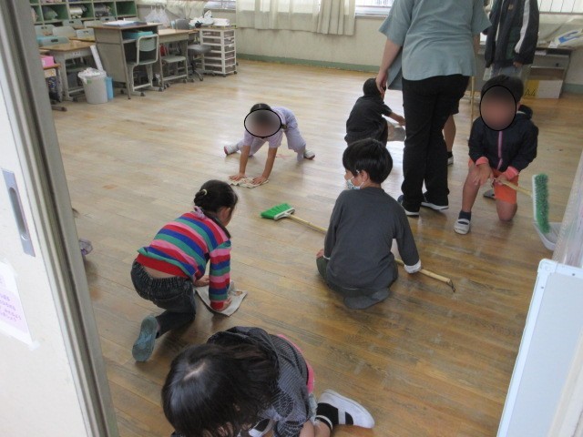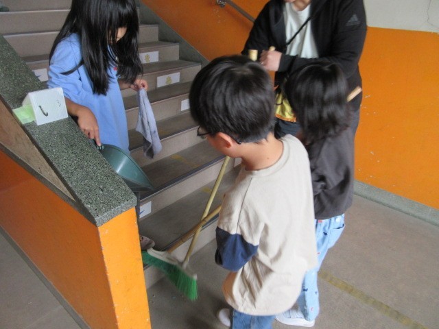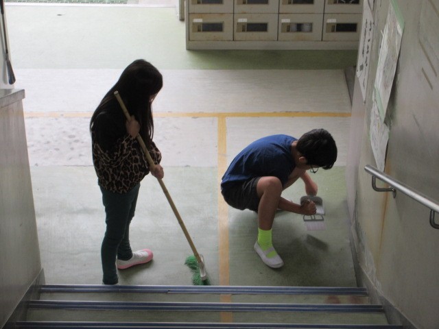掃除の時間です。低学年は何人かで分担場所を掃除しますが、高学年になると少ない人数で分担場所を掃除しています。