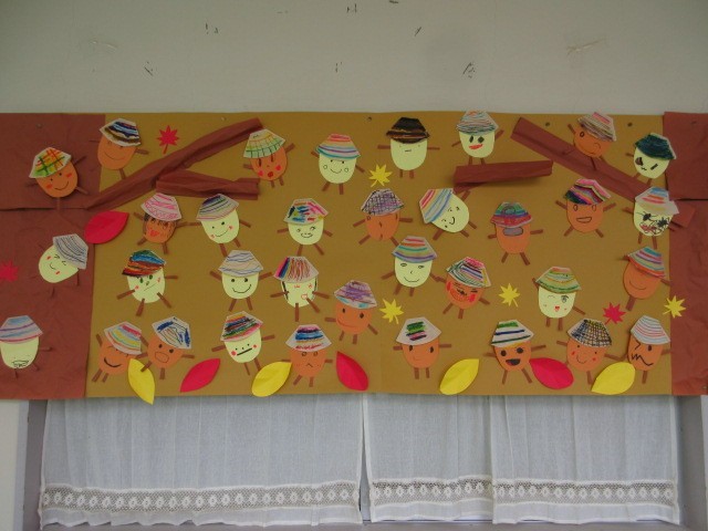 職員室前の掲示板にたんぽぽ学級の子ども達の作品が掲示されています。今回は秋のどんぐりです。どんぐりの表情が一つひとつみんな違います。ぼうしの模様も様々で、たんぽぽ学級の子ども達の様子が思い浮かびます。