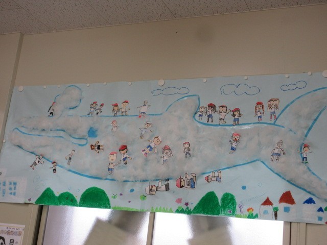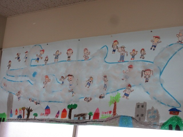 国語の学習「くじらぐも」を教室でも作りました。子ども達がくじらぐもに乗っています。背中に乗っている人やおなかにぶら下がっている人もいます。