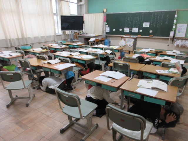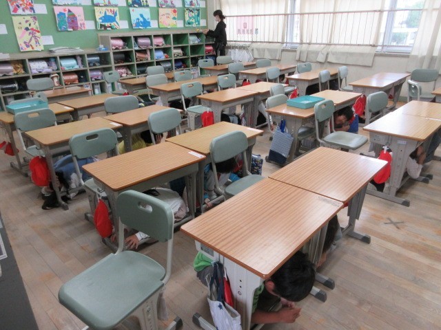 今日の10時から大阪府の訓練放送が鳴りました。それに合わせて小学校でも身を守る行動をとりました。写真では机しか見えていませんが、机の下に潜って頭を守っています。