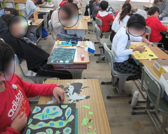 5年生の図工は、カッターを使って模様の切り抜きをしています。3枚の画用紙を重ね、下の色画用紙の色が切り抜くと見えてきます。色の見え方を考えて試行錯誤している子ども達です。