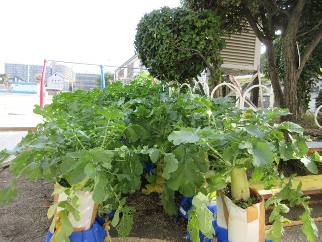 朝晩寒くなってきましたが、学校内で子ども達が植えた植物はすくすく育っている様子が見えます。ヘチマは暑い夏を乗り切り2階の窓近くに実が見えています。2年生が植えたはつかだいこんと1年生が植えたチューリップの芽が見えてきました。3年生が育てている大根は、葉を生い茂らせてすくすく育っています。