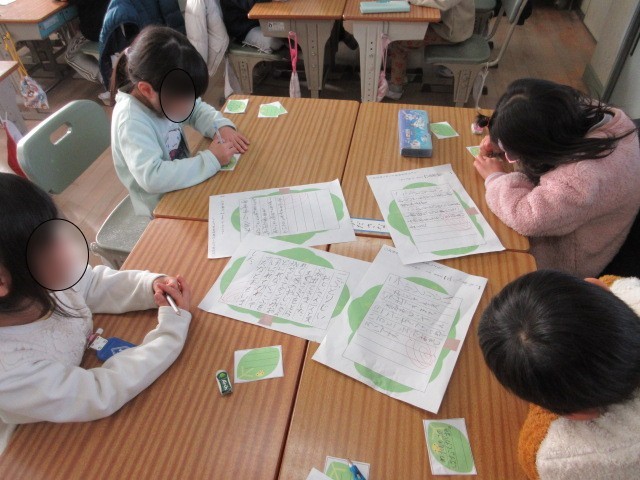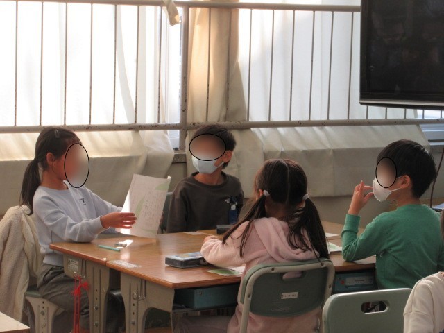 国語の時間の学習で、昔ばなしの感想を書きました。今日はその作文を班の友だちに伝えて、一言感想を書いているところでした。どの班も友だちの発表をしっかり聞いて、書いている様子でした。