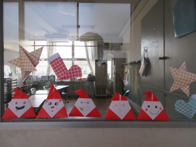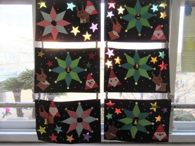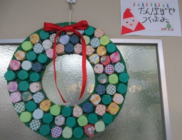 たんぽぽ学級の子ども達が作成した作品が校舎のいろいろな所に掲示されています。職員室の前の大きなリースはペットボトルキャップを使っています。どの作品も見事な仕上がりです。