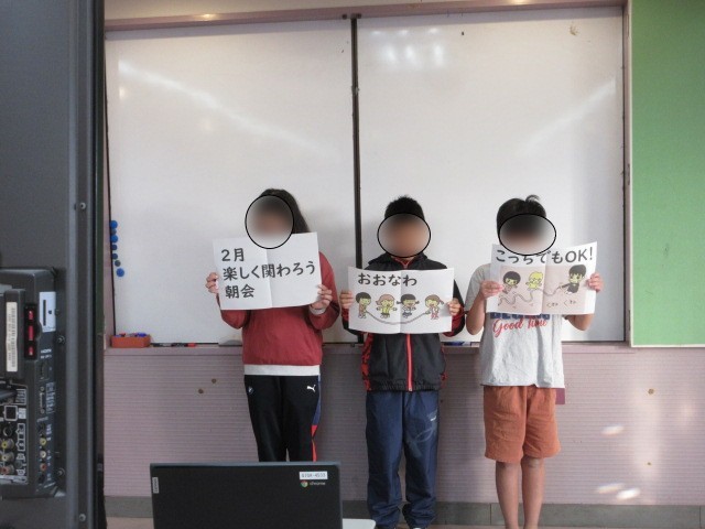 今日の児童朝会は、今週の委員会の活動を受けて様々な委員会からの報告がありました。代議員からは、2月に「楽しく大なわをしよう」と提案をしてくれました。校長先生からは、避難訓練に合わせて地震のお話をしました。各ご家庭でも地震についてお話をする機会に繋げて頂けると有難いです。