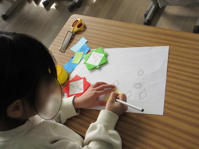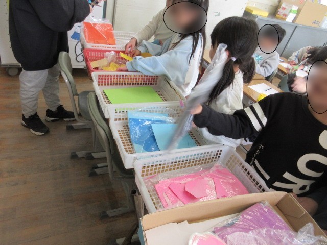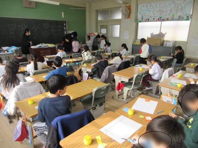 1年生は、入学してくる1年生に渡すメダルを作成していました。メッセージの周りに、いろいろな飾りを付ける工夫に取り組んでいる1年生の子ども達でした。