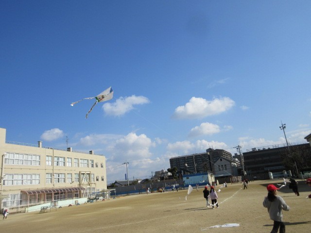 1年生は生活科の時間にお正月の遊びに取り組んでいます。この日は自分たちで絵を描いた凧をあげていました。かぜも吹いていてよくあがっていました。