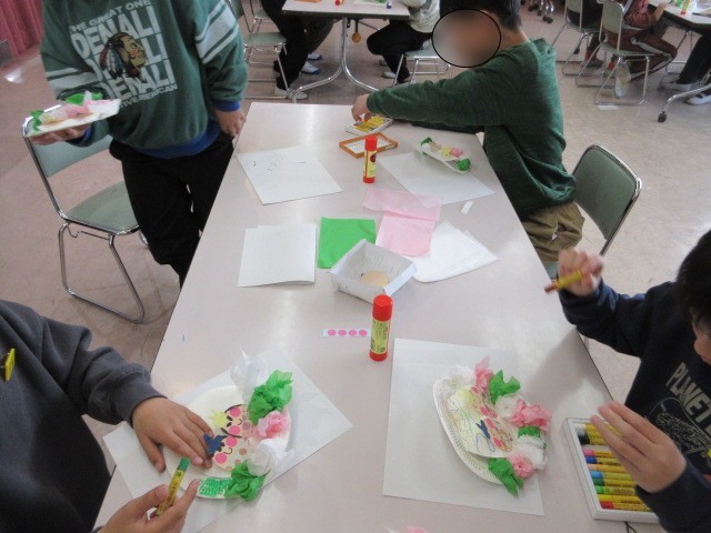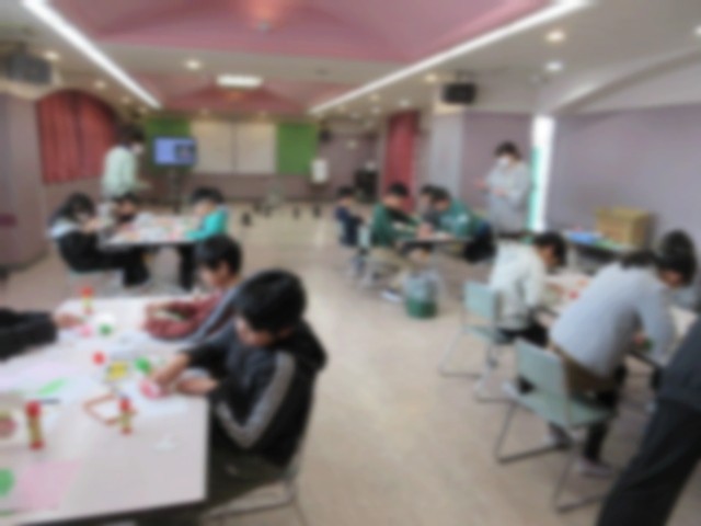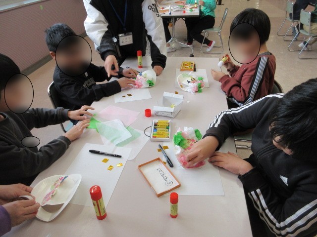 たんぽぽ学級では、3月に向けておひなさまの置きかざりを作っていました。おひなさまとお内裏さまは、子ども一人ひとりが顔を描いていました。いろいろな表情のおひなさまができていました。