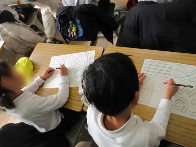 今日は、天美保育園の5歳児さんたちが来てくれました。4時間目は教室で学校体験をしてもらいました。えんぴつをもって線をかいたり、「く」のじを書いてみました。給食は、5年生と一緒に食べました。お兄さんお姉さんと楽しくお話しながら食べました。