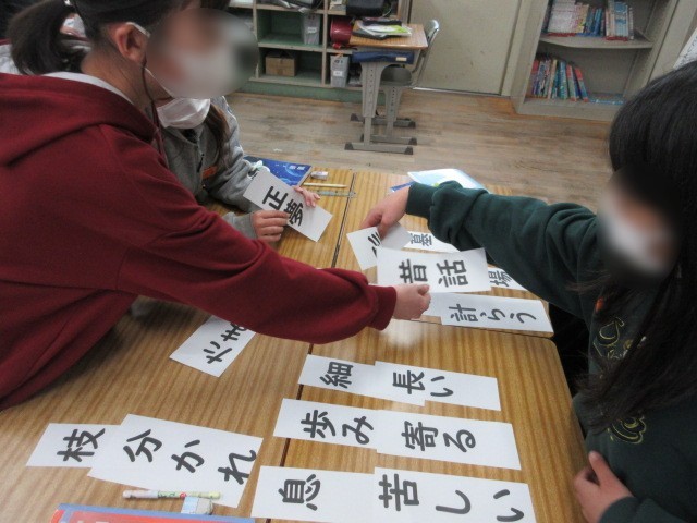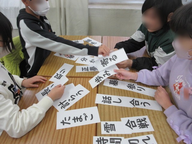 5年生の国語は、複合語について学習しています。用意された言葉を繋いで複合語を見つける学習中です。班で友だちと一緒に言葉を考えています。言葉って難しいですね。