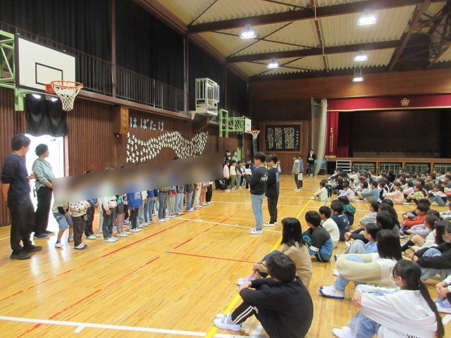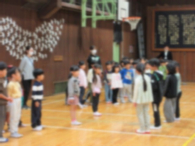 今日は1時間目に対面式がありました。1年生と上級生の顔合わせでした。児童会代表の6年生からの言葉と、2年生からのメダルのプレゼントがありました。1年生からも「よろしくおねがいします」の元気な挨拶がありました。緊張気味のかわいい1年生の様子でした。