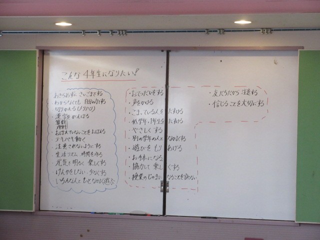 4年生は、学年集会で自分たちが考えた「なりたい4年生」について話し合っていました。高学年になろうとしている前向きな姿が見えた子ども達の様子でした。