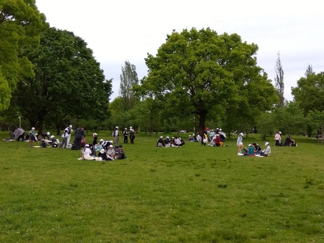 緑地内の大広場に移動しお弁当タイムのスタートです。班ごとに仲良く食べています。お弁当のあとはおやつタイムと春フェス(クラスレクリエーション)です。
