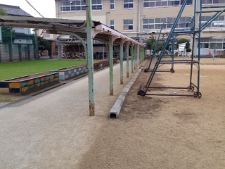本館から体育館までの渡り廊下、グラウンドからの砂の流入が激しく、体育館に砂が上がる原因になっていました。ブロックを買い足し、地中に埋めて固定し、ブロックの隙間を埋めました。一期工事二期工事とも本校技能員さんの丁寧な工事で、ほとんどの砂の流入を止めれそうです。
