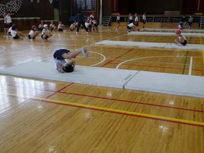 5年生は、体育館での体育。体育館の中も、冷え切っていましたが、マット運動に高跳びを意識したゴム跳びにがんばっていました。