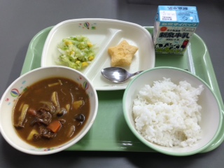 11月9日(水)この日の給食も秋メニュー、「秋野菜のこめこカレーライス」でした。外は、冬でしたが、お腹は秋の食材を楽しみました。