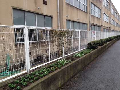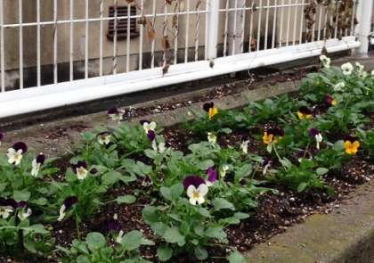 北校舎道沿いの花壇の花を植え変えました。白・紫・黄色の色がかわいいです。花名のビオラ。パンジーとヨーロッパのスミレ(ビオラ・コルヌータ種)を交配した品種だそうです。パンジーはフランス語の「パンセ(思想)」にちなんで名づけられたそうで、ビオラの花言葉も「思慮深い」という意味もあるそうです。