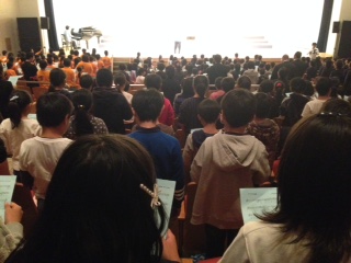 松原市小学校連合音楽会が、始まりました。松原市教育委員会からの挨拶の後、参加者全員で、「すてきな友達」を歌いました。きれいな声が会場をつつみました。