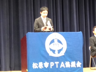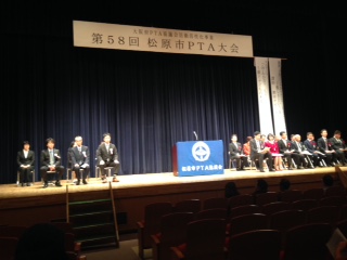 阪中会長の挨拶で、PTA大会が始まりました。澤井市長、高阪教育長を始め、多くの来賓の方のご臨席をいただきました。写真の大会宣言、大会決議、大会スローガンが承認されました。