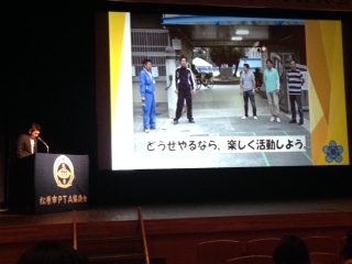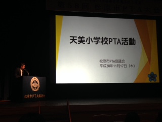 天美小学校のPTA活動を、北田顧問が報告されました。PTA全員活動と体育大会の保護者入場システムを中心に報告されました。特に体育大会の報告では、他校の参加者の「なるほど 」とのささやきも聞こえてきました。最後に、天美小学校PTAの「どうせやるなら、楽しくやろう!」との、天美小学校PTA活動の合言葉で、締めくくられました。