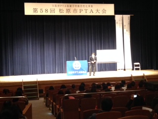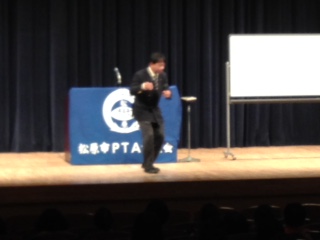 PTA大会の最後に、講演会が始まりました。「あーよかったな あなたがいて 優しさという温かい貯金箱」というタイトルで、仲島正教さんからのマシンガントークが、始まりました。