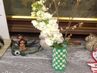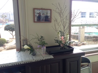 今日も、岡島さん牧嶋さんが、春を感じさせてくれる花を生けていただきました。今日のお花は、彼岸桜、ストック、スイートピー、アストロミディアム、レザーファン、カラー、ゆきやなぎです。