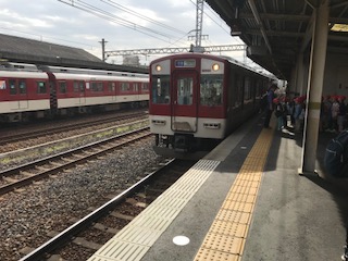 河内天美駅を出発しました。車内では、静かに過ごしているお利口さんです。