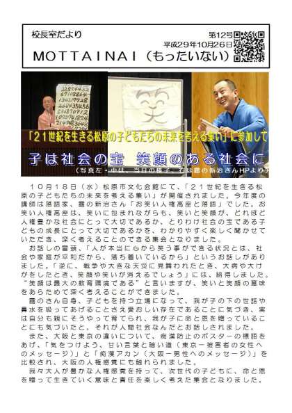 校長室だより「もったいない」第12号、明日配布します。太字をクリックしていただくか、配布文書一覧から鮮明な文書をご覧いただけます。