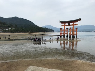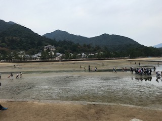 記念撮影、ちょうど雨も上がりました。干潮で、鳥居の近くまで、見えています。