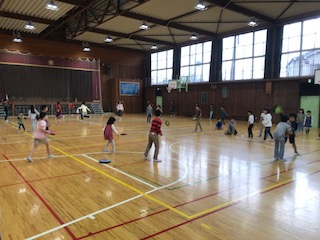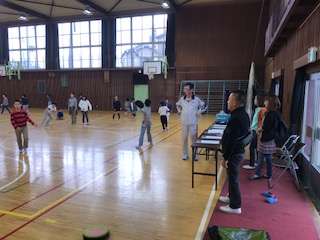 なかよしくらぶ、まもなく開始です。すでに沢山の子どもたちが、体育館で遊んでいます。今日も、なかよしくらぶ推進委員会の皆様、PTAスタッフの皆様、お世話になります。