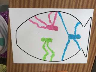 想像力を働かせて、つぼの中に、ゴムにんげんを描いています!