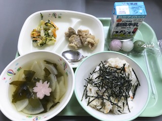 今日は、お花見献立で、花見団子がついてます。