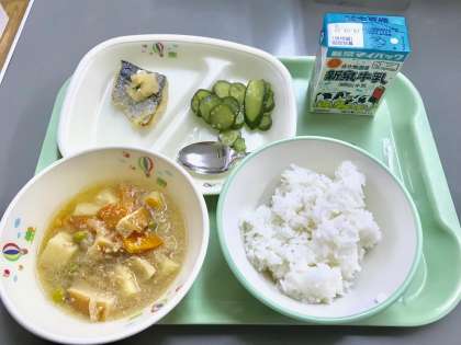 今日のメニューは、新じゃがのそぼろ煮と、さわらのおろしだれゆず風味、きゅうりのごま塩あえです。