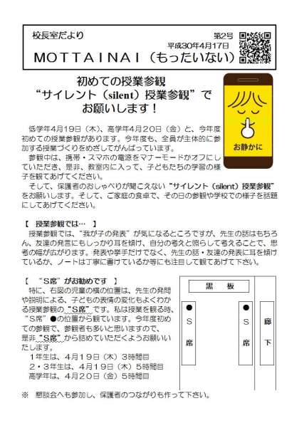 校長室だより「もったいない」第2号