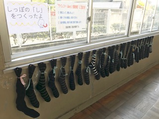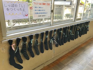 くつ下で、しっぽの「し」をつくりました。廊下に並べています。