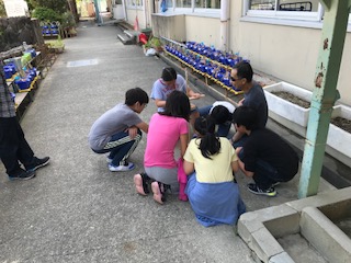 理科準備室に、火起こし体験キットがありました。赤井先生の指導で、火起こしに挑戦しています。