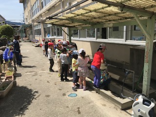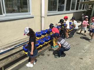 2年生からプレゼントされた、アサガオの種。鉢にたっぷりの土と肥料を入れ、種をまきました。