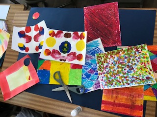 小さな画用紙に、おもいおもいの色をぬり、それを切り取り、貼り付けて、自分の作品をつくります。