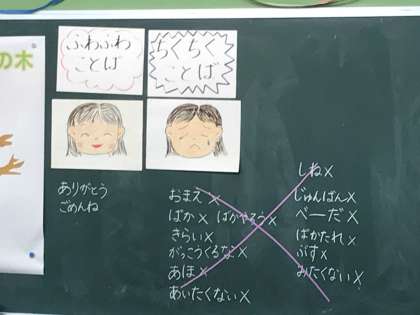 言われてうれしい、“ふわふわことば”(ありがとう、ごめんね・・・)、言われても、言ってしまっても、うれしくない“ちくちくことば”(人をきづつけることば)。一人一人が、自分の大切なふわふわことばを、一枚一枚の葉っぱに書き込み、みんなで“ふわふわの木”をつくりました。