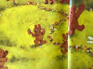 登場人物の挿し絵の動物に、自分で考えたセリフを書き込んでいます。「なんて書いたの?」お家でも聞いてあげてください。