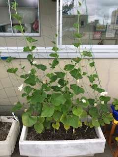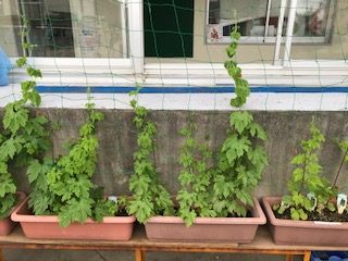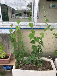 休みの間に、グッと成長しています。ひょうたん・ヘチマは、記録のテープを貼り付けることができない程、成長しています。