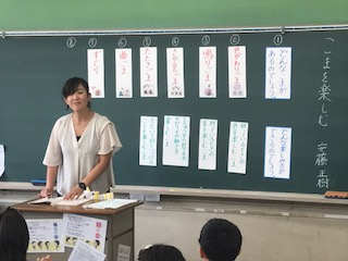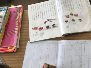 説明文「こまを楽しむ」。こまの仕組みや楽しみ方について、楽しく学んでいます。