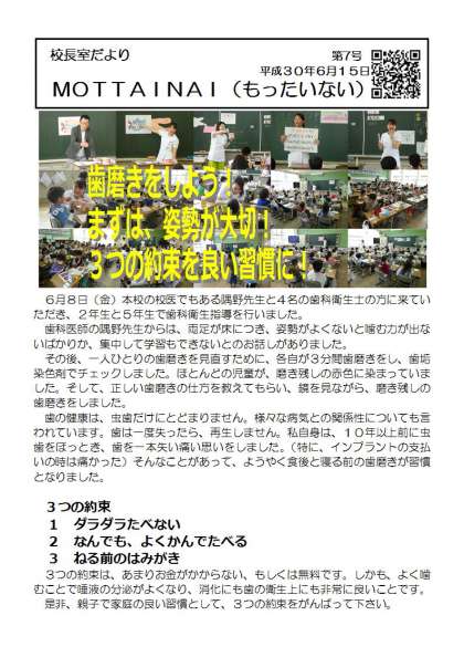 本日、校長室だより「もったいない」第7号を配布します。配布文書一覧か太字をクリックしていただくと鮮明な文書をご覧いただけます。