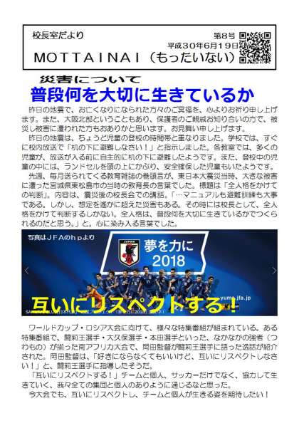 本日、校長室だより「もったいない」第8号を配布しました。配布文書一覧か太字をクリックすると鮮明な文書をご覧いただけます。
