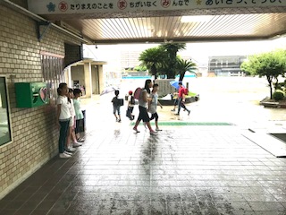 今日は、雨なので、ロビーでのあいさつ運動です。