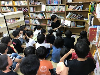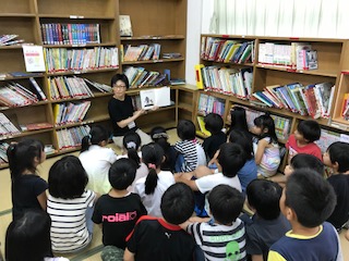 図書館司書の方に読み聞かせをしてもらっています。みんなお話に集中しています。